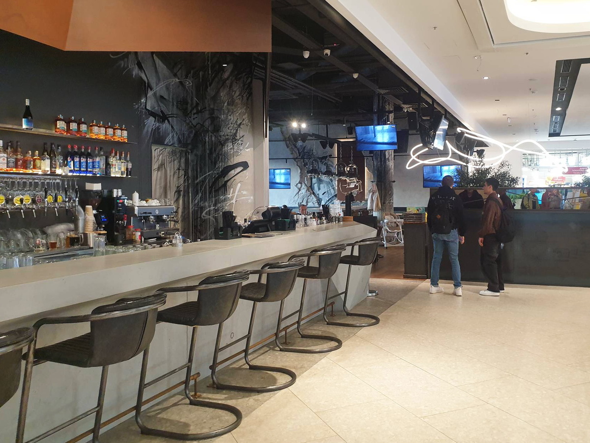 Ресторан занимает обширное пространство на первом этаже торгового центра, вмещая до 150 гостей. Интерьер представляет собой стильный синтез современности и индустриального шарма, объединяющий металл, дерево и бетон. Посетителей встречает мягкая мебель из текстиля и кожи, создающая комфортную атмосферу для встреч с друзьями и семейных ужинов.