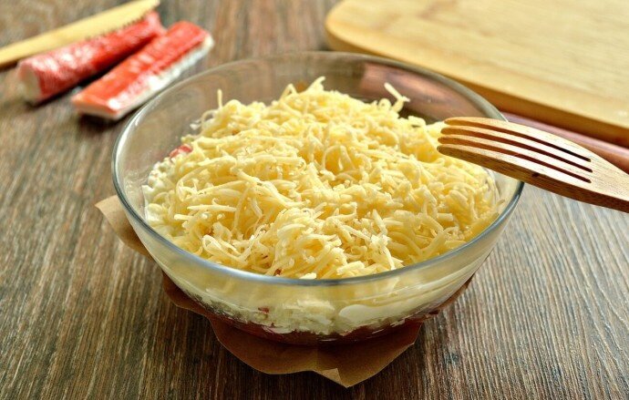 На завершающий этап натрите сыр и аккуратно разместите его сверху. Этот слой не нужно обрабатывать майонезом.
