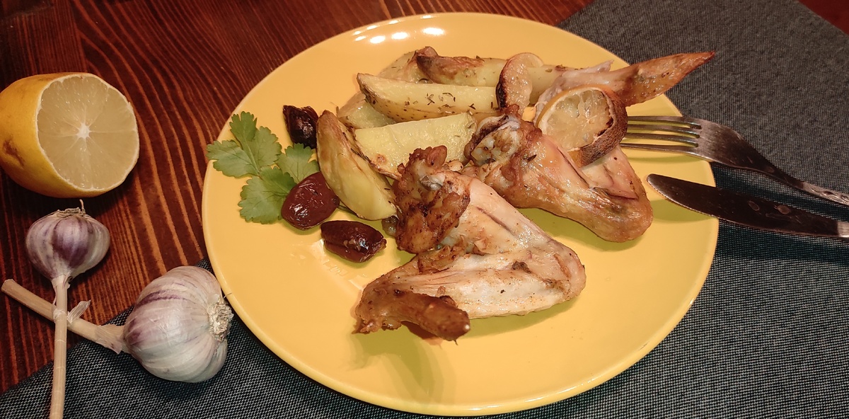 Противень застилается фольгой с приподнятыми краями, чтобы легко было убирать лишний сок. В миске картофель смешивается со специями и оливковым маслом, а затем равномерно распределяется по противню. К курице добавляются пряности, солится и перемешивается с чесноком. Кусочки курицы выкладываются на картофель, между ними располагаются дольки лимона и оливки.