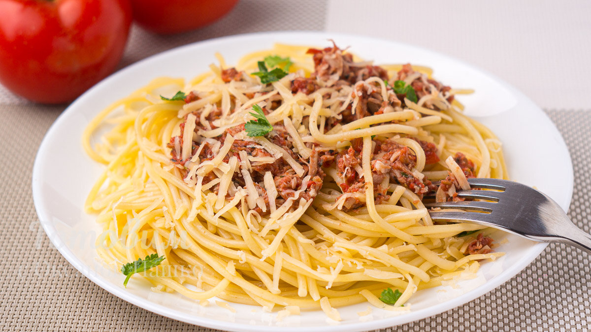 7. Подаем горячую пасту на порционных тарелках, сверху поливаем томатным соусом с тунцом. Блюдо посыпаем тертым сыром и украшаем свежими зелеными листьями.