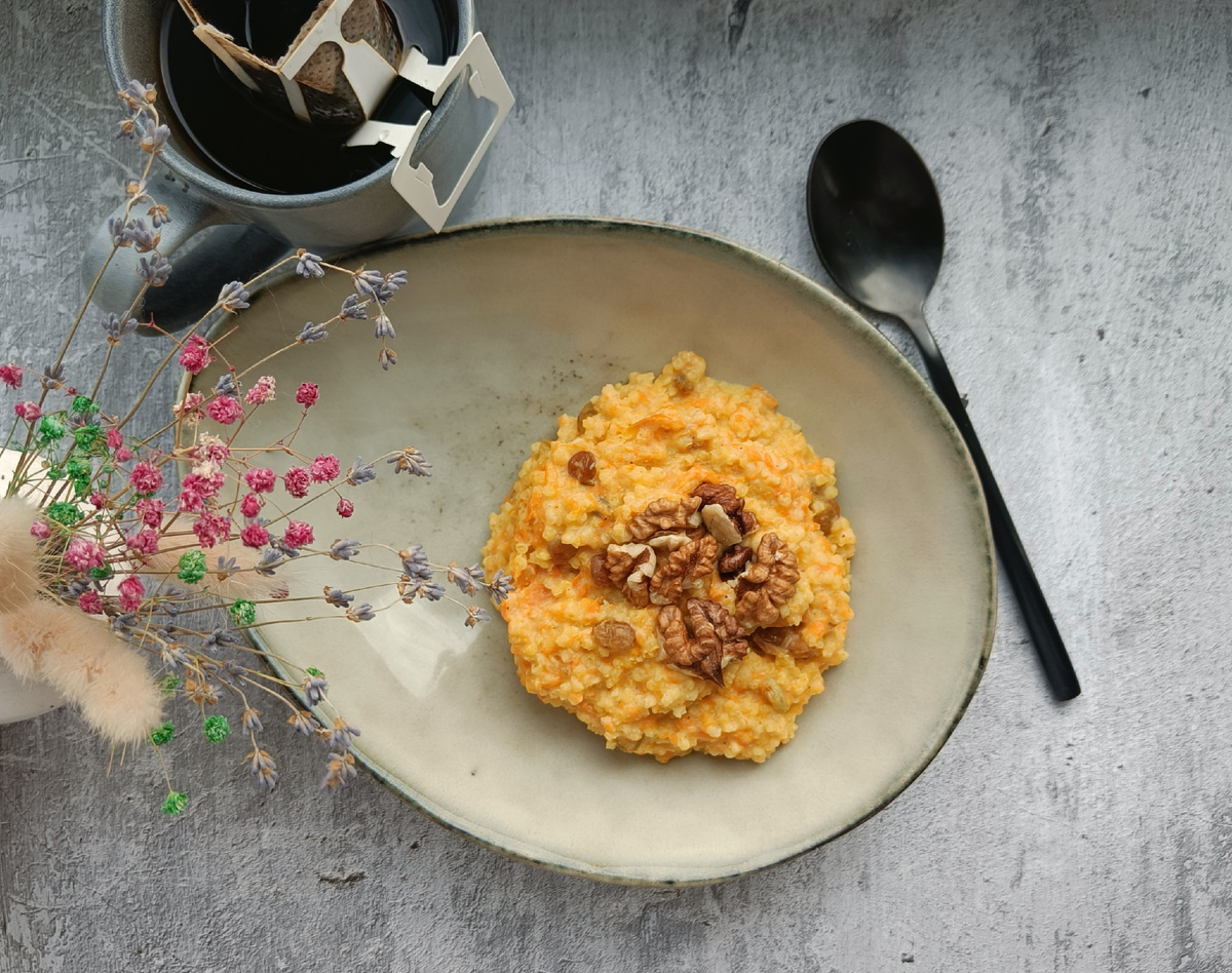 - Пшённая каша с тыквой и сухофруктами: Простой и сытный завтрак, который можно быстро приготовить, замочив пшено на ночь, а утром добавив замороженную тыкву, сухофрукты и корицу.