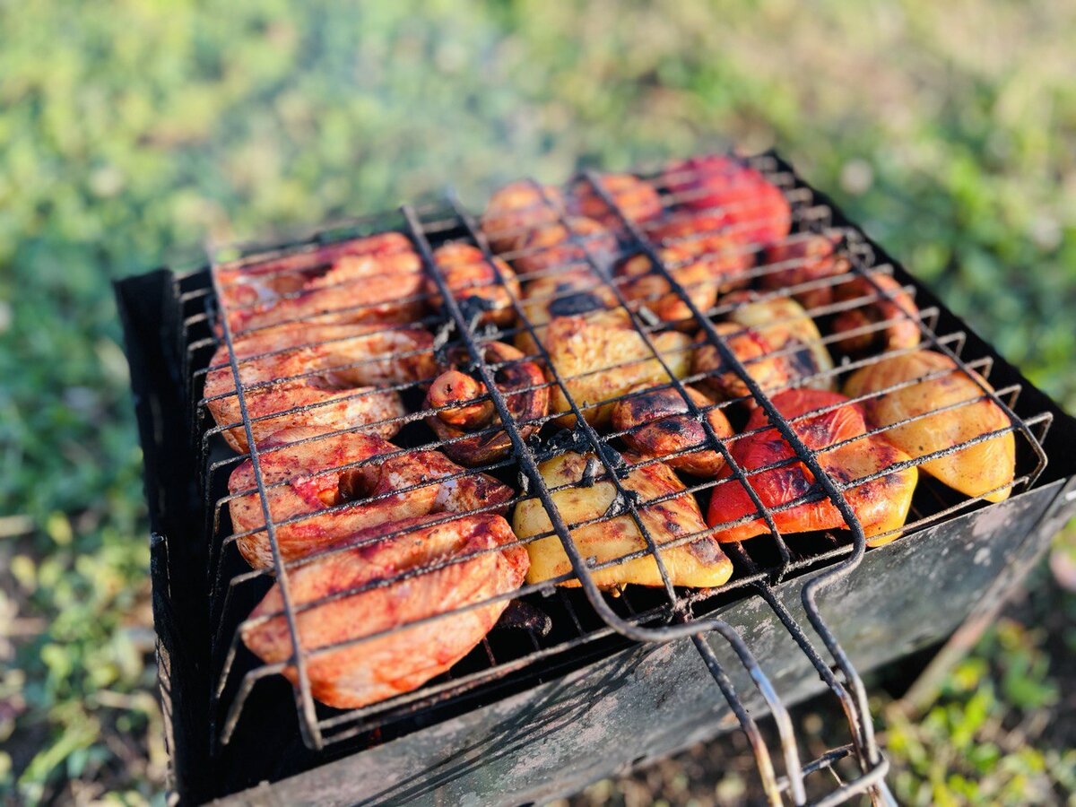 Пока рыба маринуется, разжигайте угли до серой золы. Установите решетку, чтобы избежать прилипания рыбы к углям.