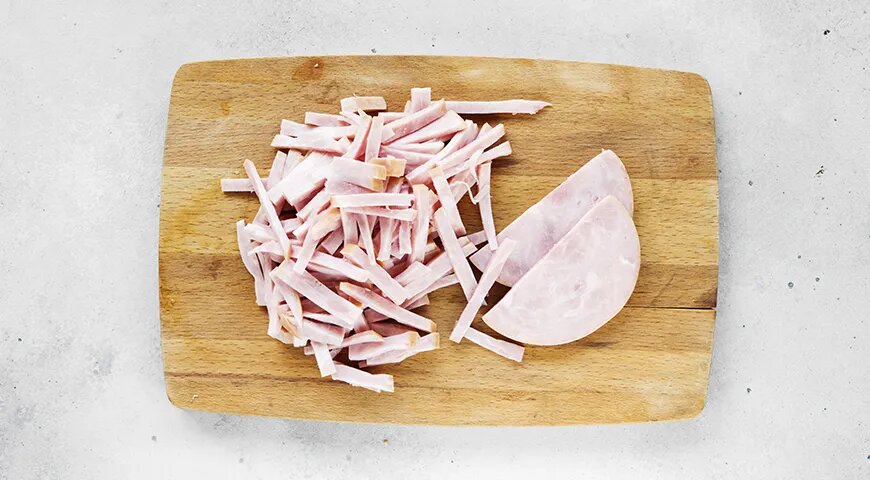 Первым шагом отварите яйца в течение 10 минут и затем остудите в холодной воде. После остывания яйца очистите и нарежьте соломкой, оставив один желток для украшения. Ветчину также нарежьте соломкой размерами примерно 3 на 5 мм.
