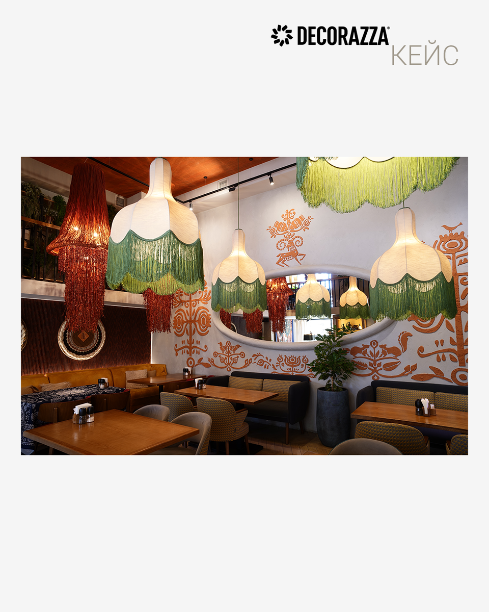 Барная зона ресторана стала настоящим «Кабинетом любопытств», где отражены грузинские традиции через витражи, текстуры и уникальные антропоморфные детали. Каждая элемент дизайна работает на создание единого эмоционального образа, заставляя гостей погружаться в атмосферу праздника и уюта.