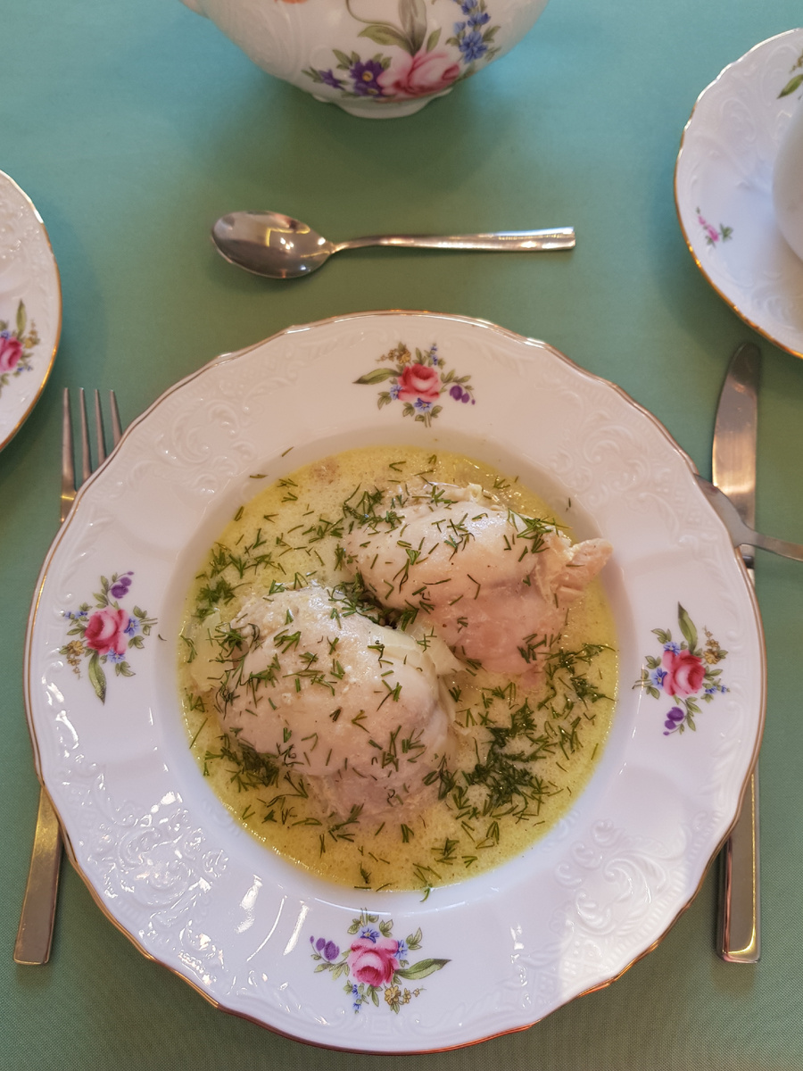 Разложить готовое гедлибже по тарелкам и посыпать свежим укропом.