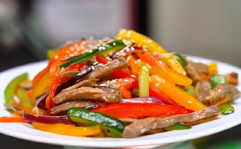 Основные ингредиенты включают соевый соус, чеснок, свежие овощи и нежное мясо, что делает Восточный салат идеальным гастрономическим перекрестком традиций и современности.