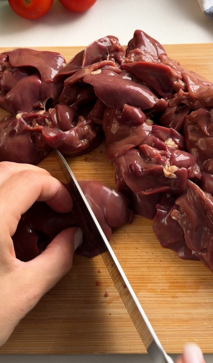 1. Нарезать печень и овощи произвольно. Обжарить печень на среднем огне в течение 7-10 минут.