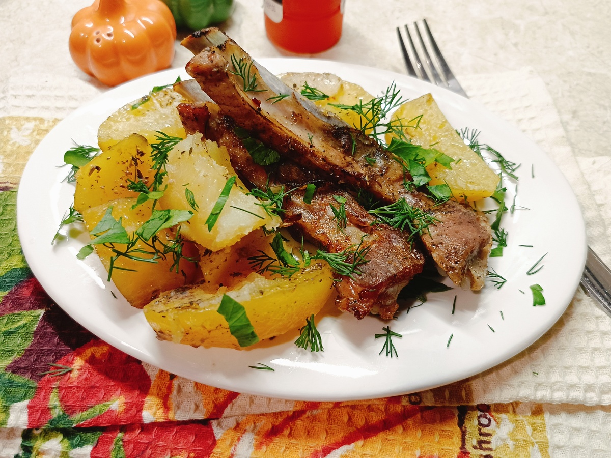 Сверху аккуратно положите подготовленные свиные рёбра и полейте их растительным маслом — это сделает корочку более хрустящей и вкусной.