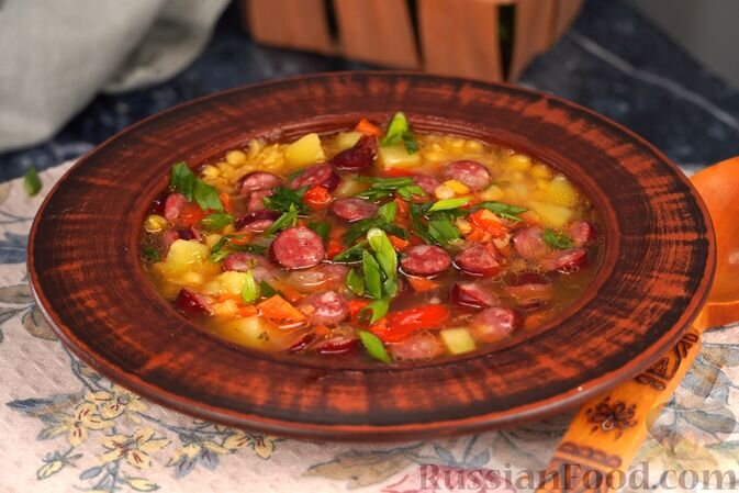 Гороховый суп с копчёными колбасками и сладким перцем: это великолепное сочетание насыщенного горохового бульона с ароматными копчёностями и сладостью болгарского перца. Яркий, ароматный, он станет отличным началом обеда.