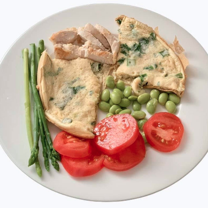 Готовые томаты и индейку нарежьте, выложите на тарелку вместе со спаржей, бобами и омлетом. Это вкусное и питательное блюдо не только насытит, но и обогатит витаминами.
