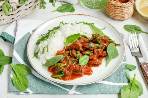 Готовый гбома десси подается на тарелке с рисом, украшенным несколькими листьями шпината. Это блюдо порадует не только разнообразием вкусов, но и насыщенным ароматом, перенесет в далекие края Того, где яркие специи и традиции сливаются воедино.