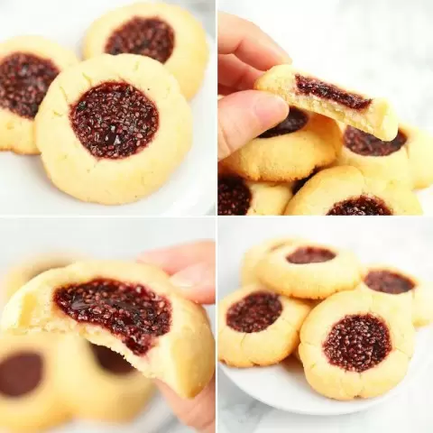 Формируют шарики небольшого размера и слегка прижимаются плоским дном карандаша или другой плоской фигурой, образуя неглубокие лунки. В каждую лунку кладут немного чиа-джема, чтобы вкус деликатно раскрылся внутри печенья. Охлаждают заготовки перед выпечкой, чтобы они не расплывались.