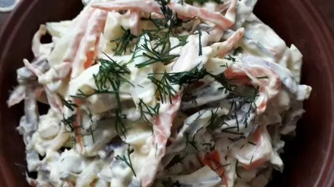 5. Соедините все подготовленные ингредиенты в глубокой миске, добавьте майонез и выбранные специи. Тщательно перемешайте, оставьте минут на 3-5, чтобы все компоненты пропитались вкусами, и подавайте к столу.