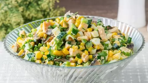 6. В большой миске смешайте кусочки куриного филе, огурцы, грибы, кукурузу, яйца, петрушку и чеснок. Посолите и заправьте майонезом, тщательно перемешайте.