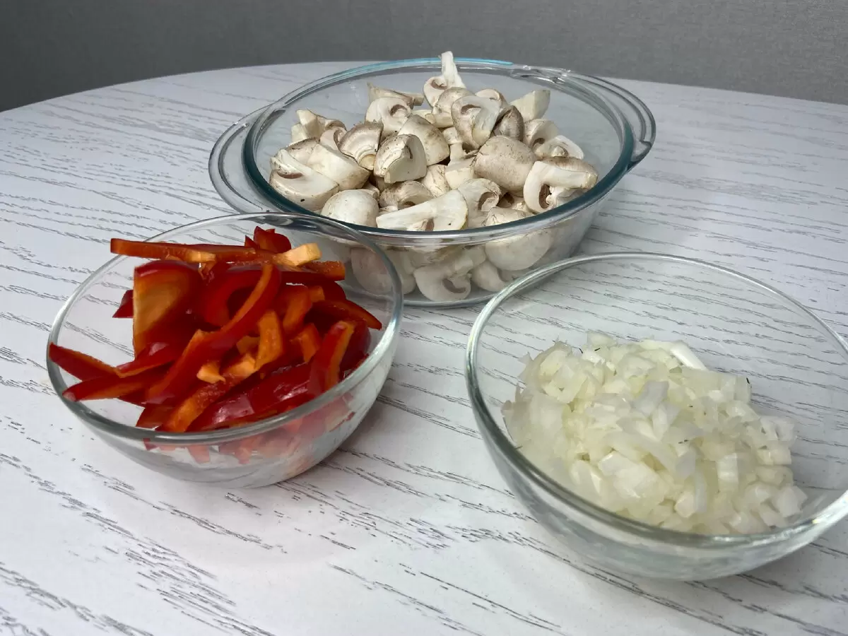 Главный ингредиент – грибы. В этом рецепте использованы шампиньоны, которые следует разрезать на четвертинки или половинки в зависимости от предпочтений. Также понадобится болгарский красный перец, нарезанный соломкой, и репчатый лук, порезанный кубиками.