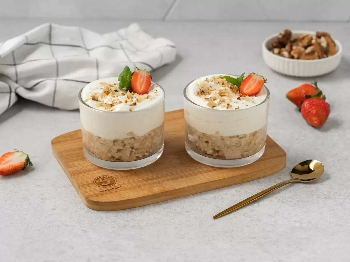 5. Добавьте финальные штрихи. Измельчите грецкие орехи и посыпьте ими верхний слой крема. Для усиления вкуса орехи можно заменить на арахис, кешью или миндаль. Украсьте десерт свежей клубникой и мятой для особого шарма.
