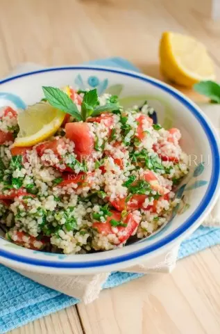 Помимо основного ингредиента, в табуле входят помидоры, зеленый лук и мята. Мелко нарезанная зелень придаст салату яркости, а мята добавит особую нотку восточной экзотики. Для заправки подойдут оливковое масло первого отжима и свежевыжатый лимонный сок. Если же нежелание использовать пряные масла мешает вам, можно смело выбирать рафинированное масло.