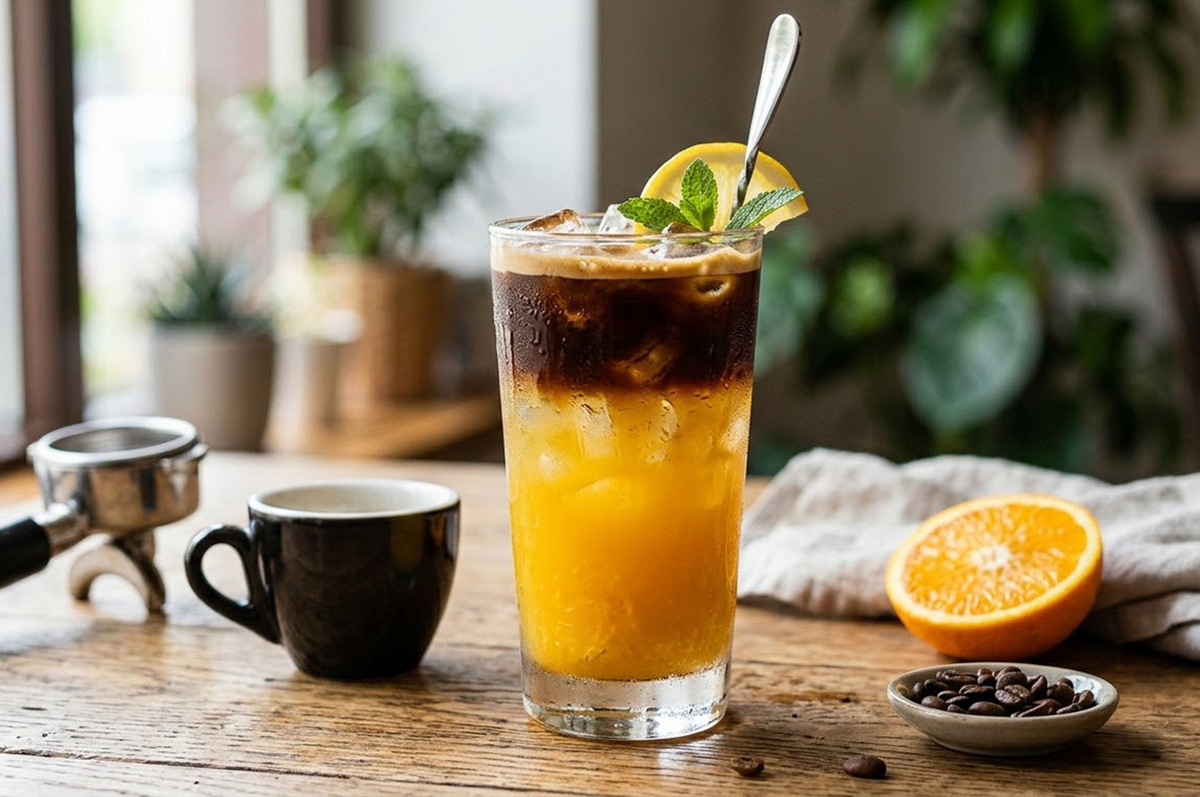 В высокий стакан выкладывают лед и заливают его холодным апельсиновым соком. Затем аккуратно добавляют слой эспрессо, который создает красивый градиент. Этот освежающий коктейль сочетает в себе сладость цитрусов и крепость кофе.