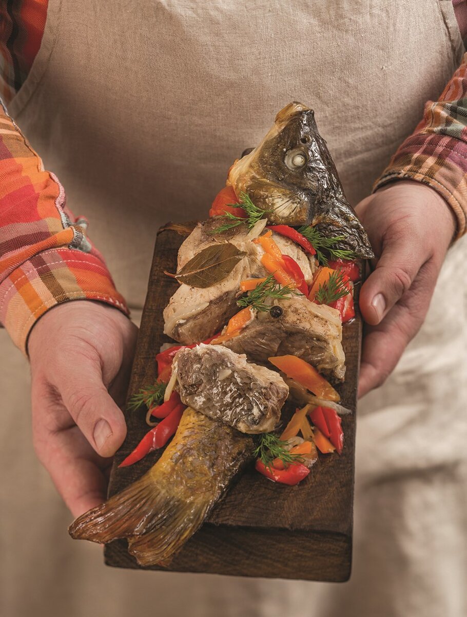Этот оригинальный рецепт представлен в книге «FOODБОЛ. Традиции. Рецепты. Стритфуд. Кулинарное путешествие по 11 футбольным столицам России». Прекрасный кулинар Олег Кучков, создатель сети ресторанов «Пироги Кучкова», подчеркивает, что толстолобик – это речная рыба из семейства карповых, а в сочетании с кореньями она становится не только нежной, но и чрезвычайно вкусной. Русская кухня издавна знала, как смягчить рыбный запах, используя разнообразные коренья, лук и специи. В некоторых случаях также добавляется огуречный рассол (1/2 стакана на 1 литр воды), чтобы улучшить вкус.