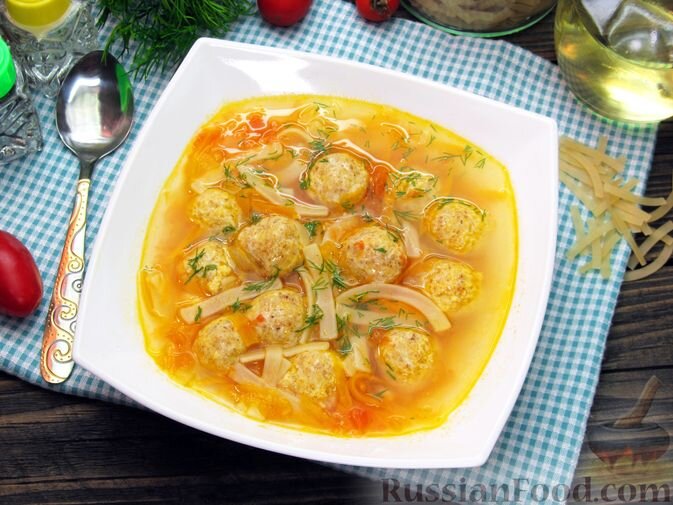 - Суп с куриными фрикадельками, лапшой и помидорами