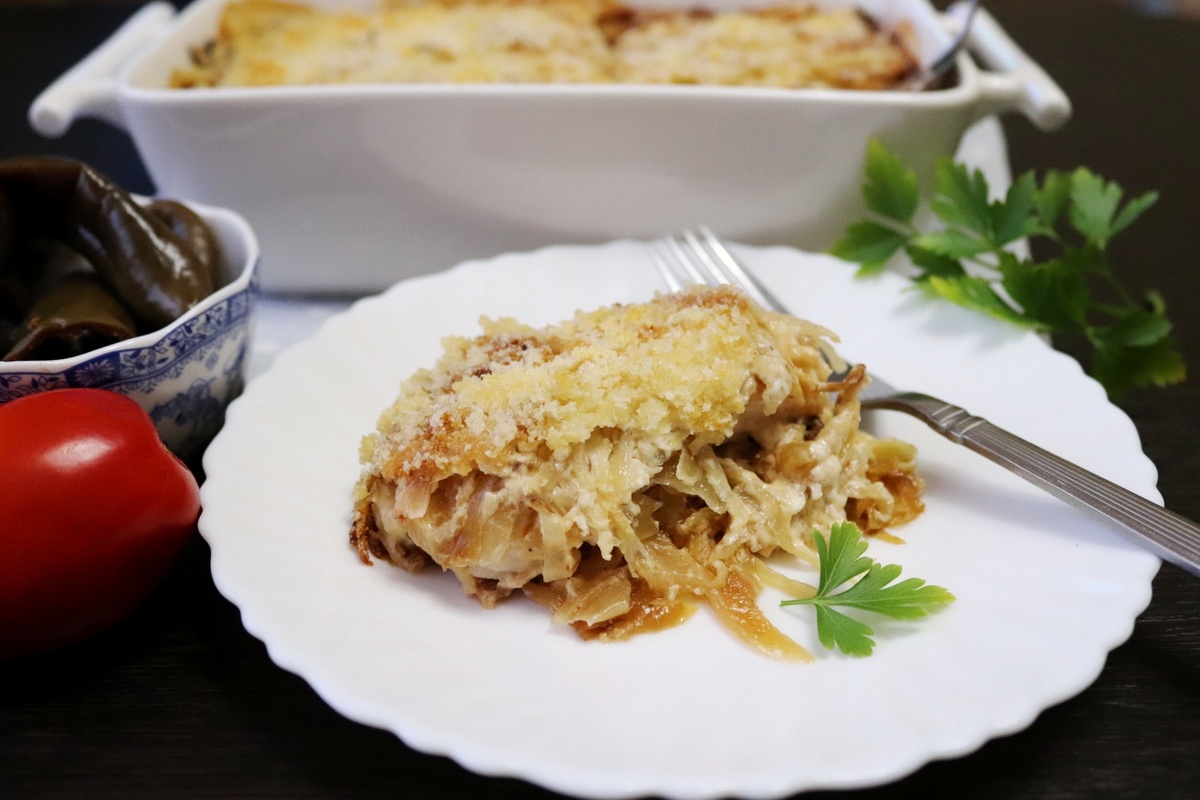 Сборка запеканки начинается с того, что на дно формы выкладывают половину капусты, сверху — обжаренную рыбу и лук, а затем снова капусту. Все заливается подготовленной смесью и оставляется на 5 минут, чтобы пропитка проникла во все слои. Сверху посыпается сухарями и отправляется в разогретую до 180°C духовку на 35-40 минут.