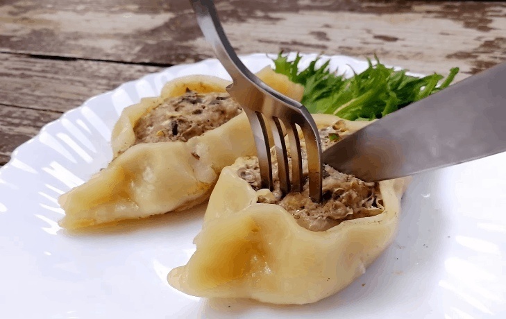 Раскатайте тесто в тонкий пласт и нарежьте его на квадраты. В центр каждого квадрата выложите начинку, формируя лодочки, защипывая края. Поместите мелкие лодочки на предварительно разогретую сковороду с растительным маслом. Обжаривайте на среднем огне до золотистой корочки снизу.
