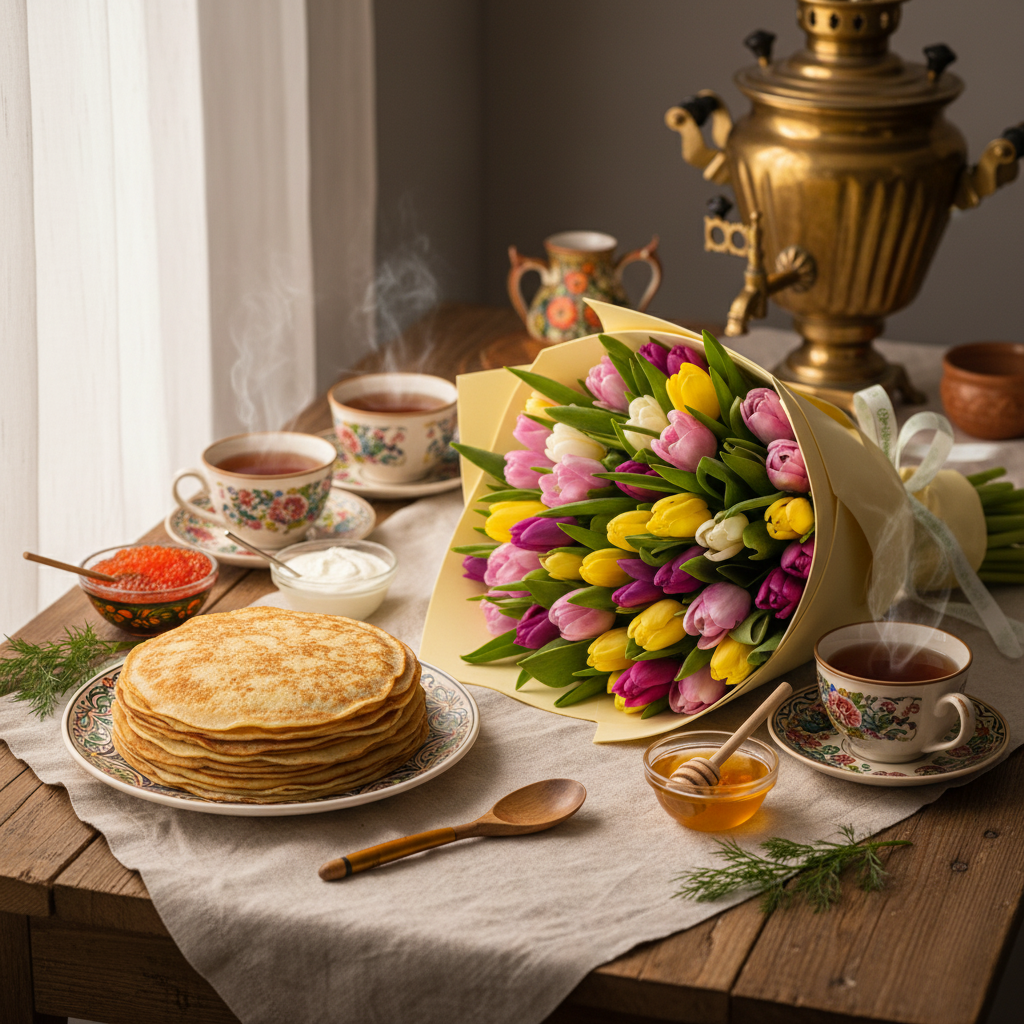 Масленица — это уникальная возможность воспользоваться традицией ходить в гости. Приглашая друзей на блины, не забудьте взять с собой цветы — это будет милым знаком внимания.
