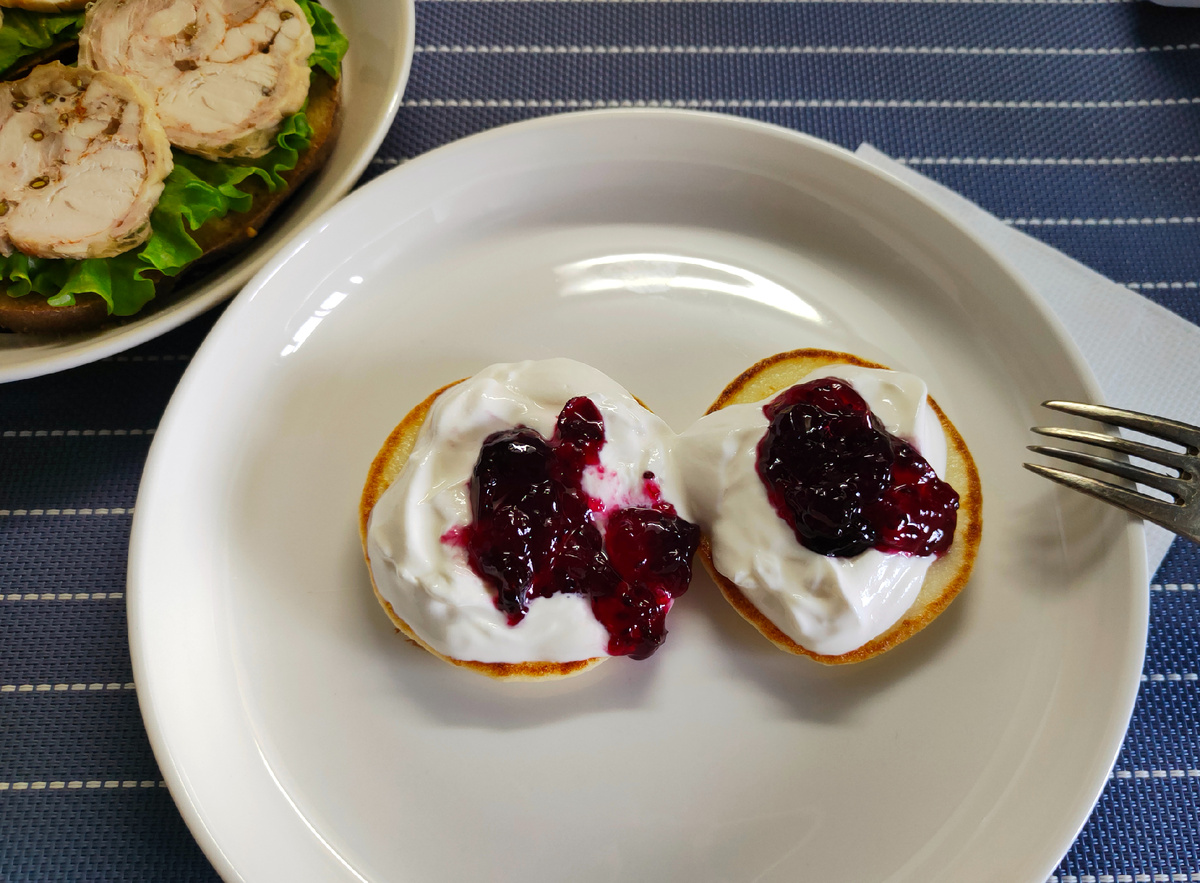 Завтрак включает блинчики на сыворотке с творогом и вареньем из черной смородины. Блинчики были заранее заморожены, а сегодня утром обжарены на минимуме масла. Обед порадует куриными бёдрами и крылышками, запеченными в духовке с острым перцем и сухим чесноком, а гарнир составит отварной рис и свежие овощи.