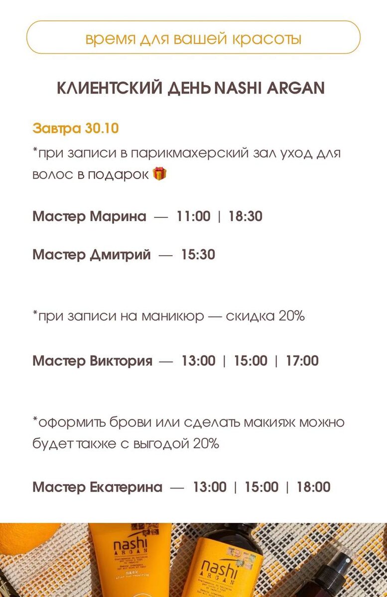 Завтра у вас есть уникальная возможность ощутить атмосферу настоящего праздника! На мероприятии будут предоставлены восхитительные угощения и приятные напитки, а также шанс познакомиться с экспертом, представителем бренда Nashi Argan.