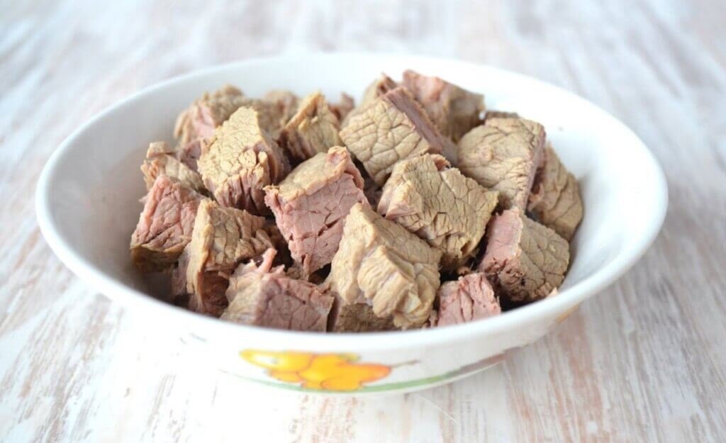 Для начала говядину нужно отварить до мягкости, добавив коренья петрушки, душистый перец и лавровый лист. Как только мясо будет готово, охладить и нарезать его на кусочки, ломтики или соломку. Лук следует нарезать полукольцами и обжарить на растительном масле до золотистого цвета. В отдельной чаше яйца взбиваются со сметаной до однородной массы.