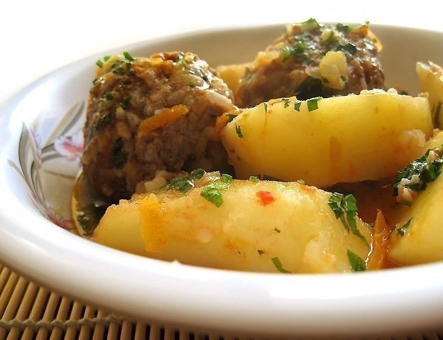 Сформировав небольшие круглые тефтельки, их обжаривают на растительном масле до золотистой корочки. Обжаренные фрикадельки следует переложить в 4-х литровую кастрюлю, добавить лавровый лист и нарезанный картофель. При желании можно добавить бульонные кубики для усиления вкуса.