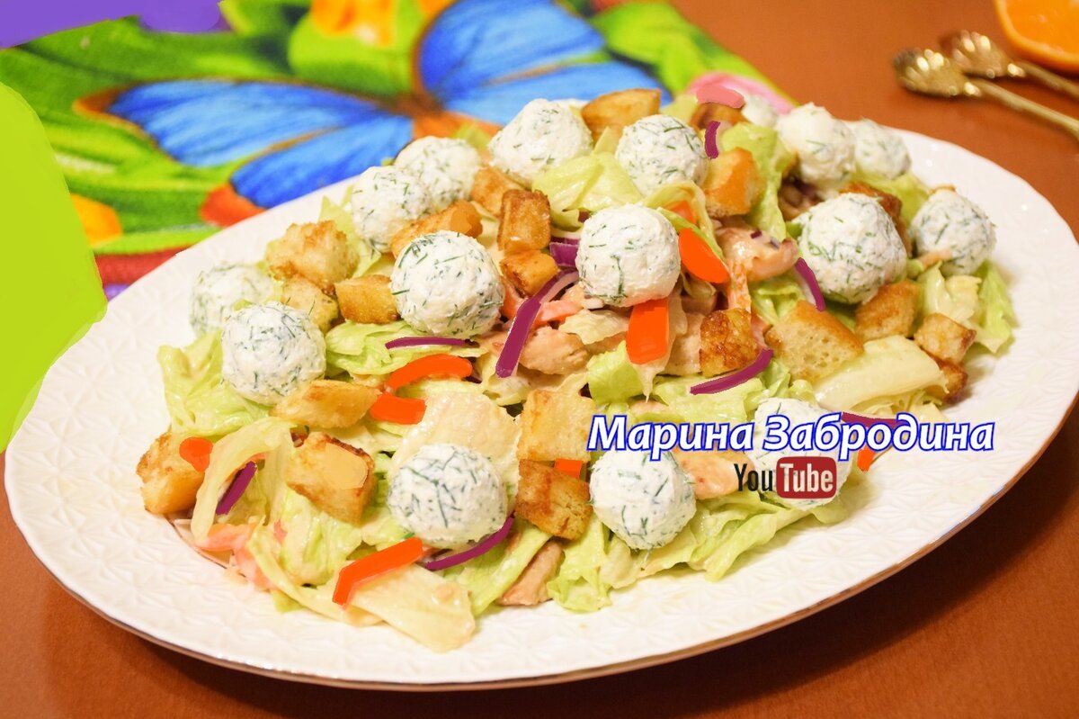 Все перемешать, полить заправкой, добавить обжаренное мясо и красиво уложить на блюдо. Сверху украсить крутонами, сырными шариками и дольками мандарина.