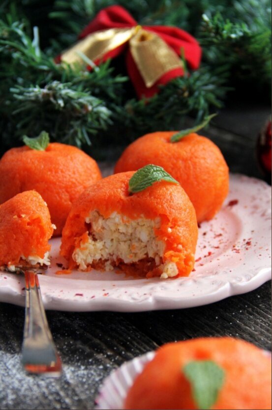 С приближением Нового года многие начинают готовить кулинарные изыски для праздничного стола. Одним из лучших решений станет яркая и аппетитная закуска "Мандаринки". Внешне она напоминает мандариновые плоды, а внутри точно скрывает нежное слоение салата. Это не просто красиво, но и очень вкусно!