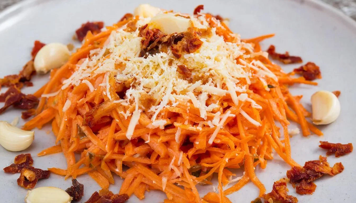 - Классический салат из моркови с сыром и чесноком подается с острым соусом.