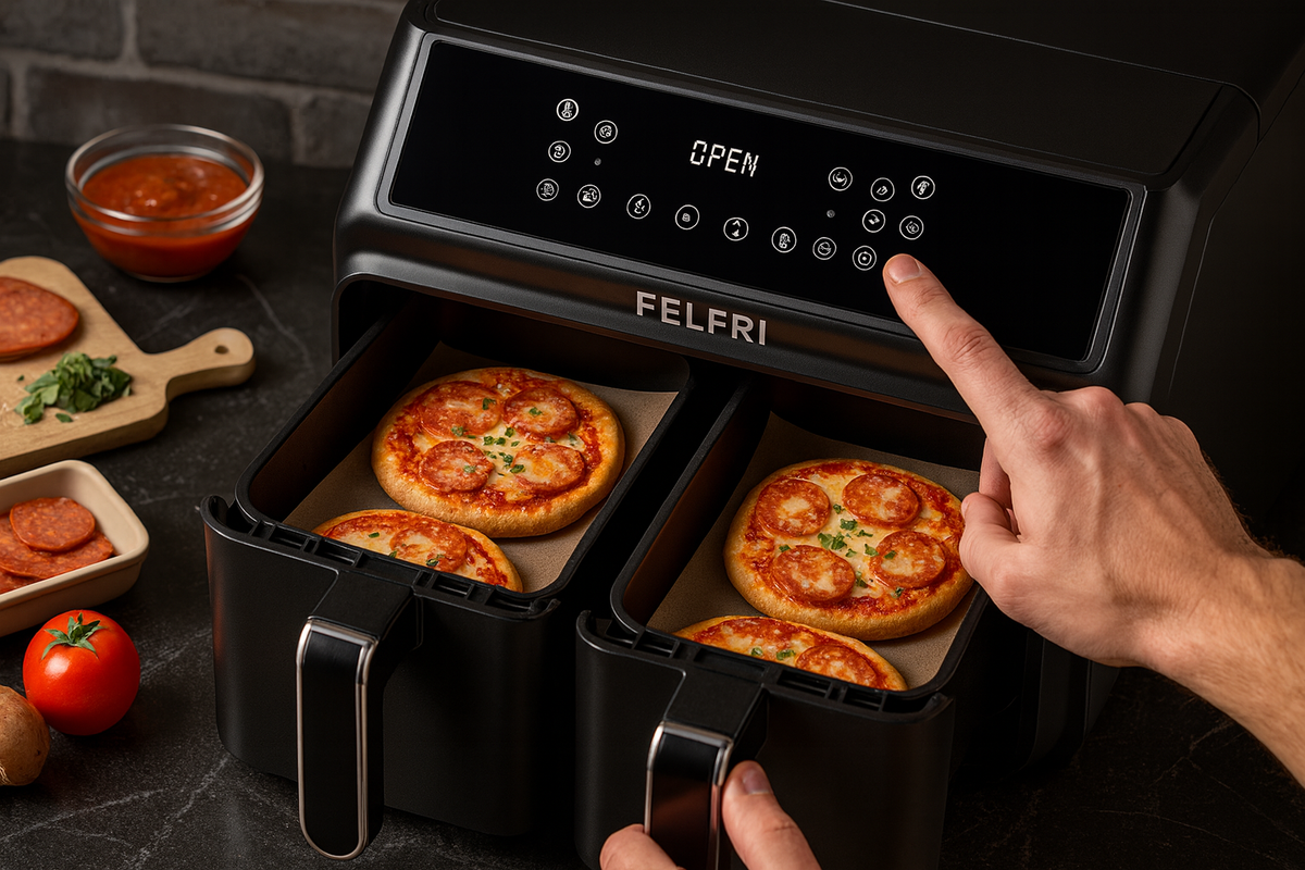 Пример воздушного аэрогриля FELFRI FF-AF-01 (объем 9 л, 9 программ) — он быстро нагревает и равномерно выпекает, избегая «сырого центра».