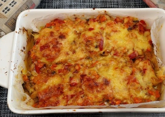 Лук, болгарский перец и морковь необходимо нарезать небольшими кубиками. Шампиньоны также нарезать и отправить на сковороду с разогретым растительным маслом, обжарив на среднем огне 5-7 минут. Тем временем, духовку следует разогреть до 180 градусов.