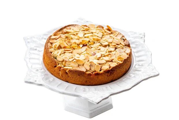 9. Присыпать миндальными лепестками и отправить в разогретую духовку на 40 минут. Проверить готовность с помощью зубочистки: если она выходит сухой, пирог готов.