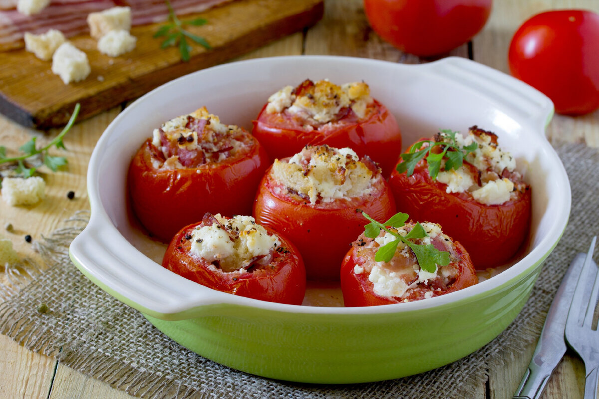 Готовые помидоры с рикоттой выглядят невероятно аппетитно и могут стать как основным блюдом, так и гармоничным дополнением к гарниру, отлично сочетаясь с кускусом или рисом. Для усиления аромата не лишним будет добавить свежий базилик или петрушку.
