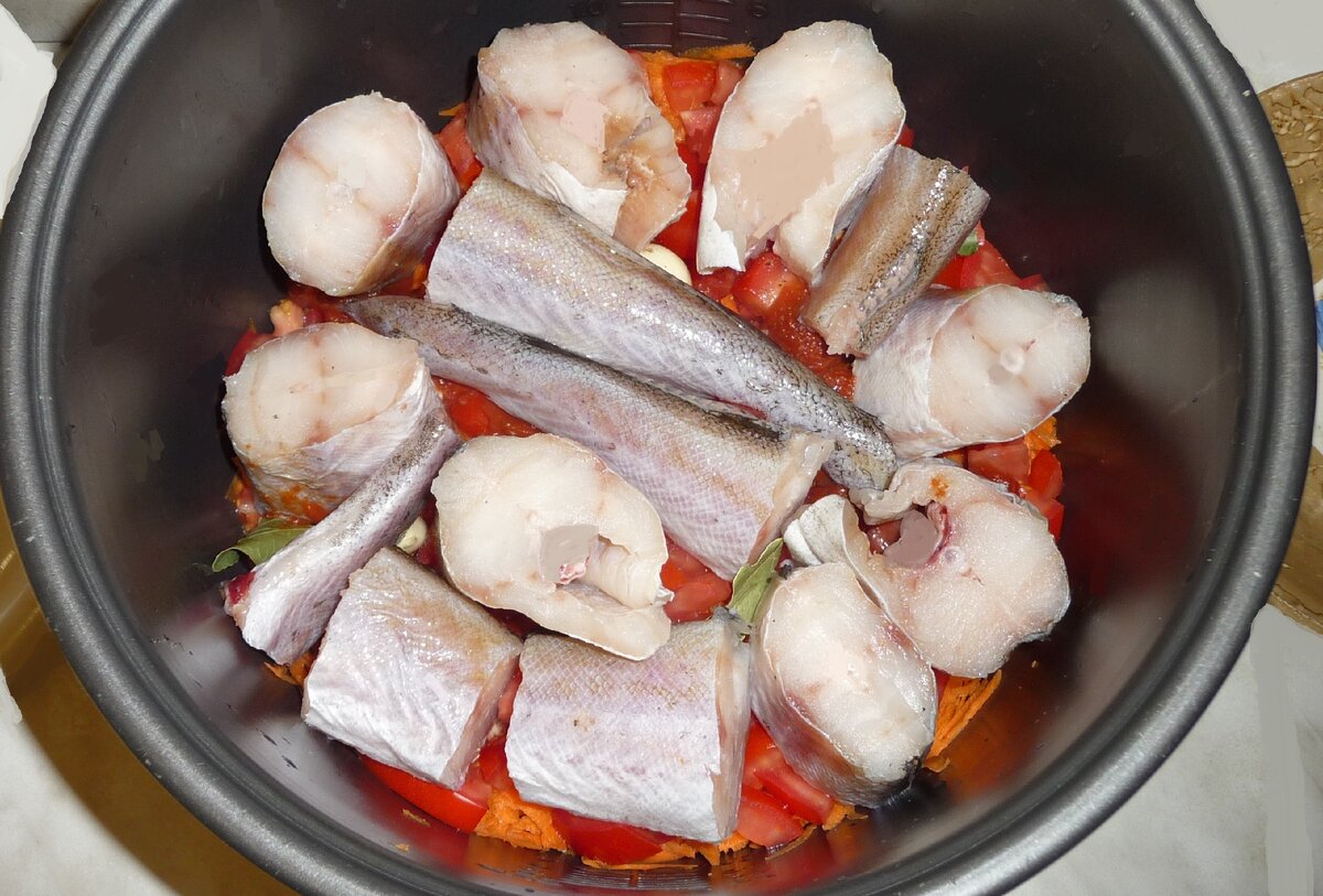 Теперь пора добавить рыбу и немного соли, потом закройте крышкой и тушите на слабом огне в течение часа. Если нет мультиварки, подойдет духовка или сковорода: всего 20 минут, и блюдо будет готово.