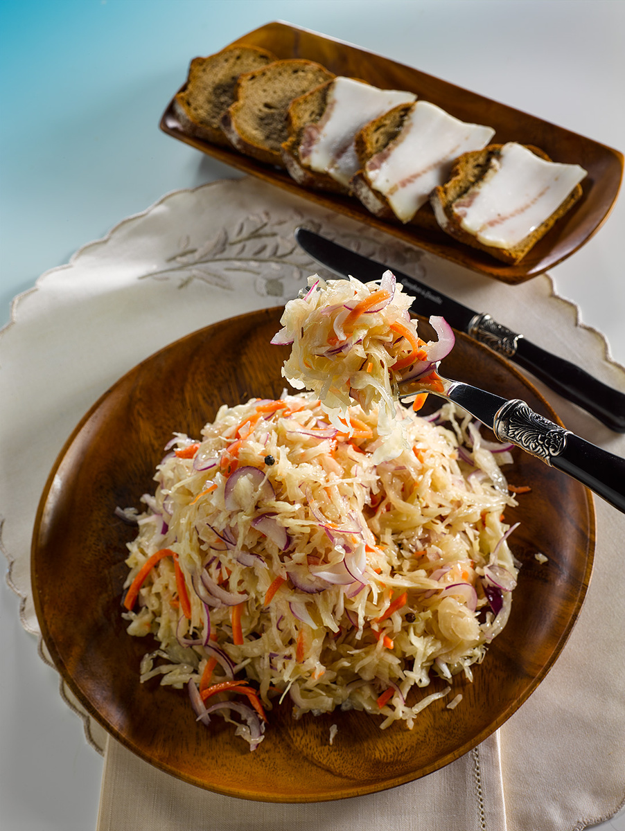 Капусту посыпают солью и тщательно давят, чтобы она пустила сок. Обычные протычки в несколько мест с помощью шомпола помогут пузырькам выйти на поверхность. Это важно, ведь капустный сок должен полностью покрывать капусту, иначе часть останется сухой и может испортиться.