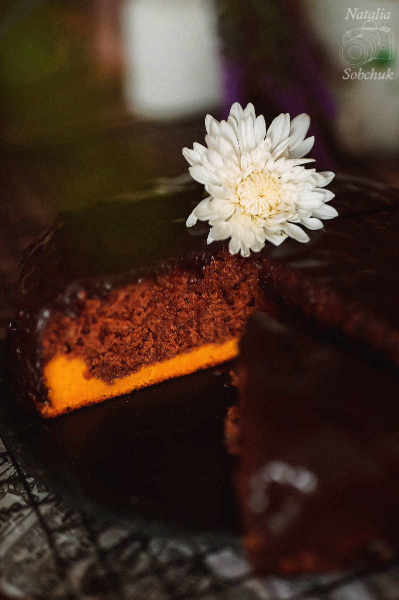 Разделите тесто на две части: в одну добавьте растопленный шоколад, в другую — тыквенное пюре и растительное масло. Выложите тыквенное тесто в форму с пергаментом, затем шоколадное. Выпекайте в разогретой духовке при 180°C в течение 45-50 минут, не открывая дверцу в первые 35 минут. Проверьте готовность деревянной палочкой.