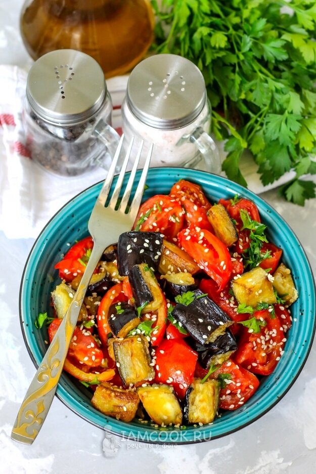 Помидоры нарезаются тонкими ломтиками, зелень измельчается. Эти ингредиенты добавляются к баклажанам в салатнике. Для завершения блюда всё приправляется солью и перцем, после чего тщательно перемешивается.
