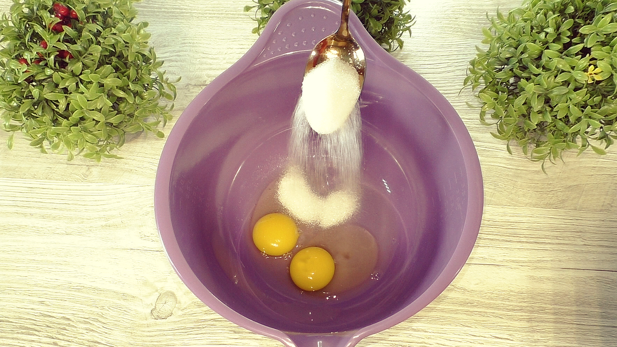 1. Подготовьте ингредиенты: яйца должны быть комнатной температуры. В миску вбейте яйца и добавьте одну столовую ложку сахара, перемешайте. Важно! Не добавляйте соль на этом этапе, иначе дрожжи могут потерять свою активность, а блины забудут о своей пушистости.