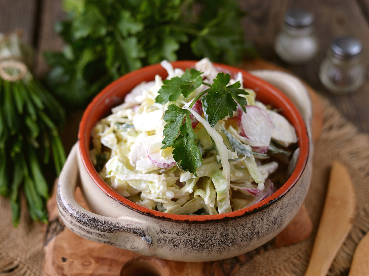 1. Начиная с капусты, ее следует тонко нашинковать и слегка помять руками, чтобы она стала мягкой и начала выделять сок. Это ключевой момент для сохранения сочности салата. 2. Черемшу мелко нарезать и равномерно распределить по капусте, чтобы вкус был гармоничным. 3. Редис нарезать тонкими ломтиками, а шампиньон очистить и тоже нарезать тонко. Сырой гриб придаст текстуру. 4. Куриное яйцо отварить не более 10 минут, остудить и нарезать кубиками. Это важно, чтобы желток не пересушился и не испортил структуру салата. 5. В завершение добавить рубленую петрушку, соль по вкусу и немного черного перца. Положите 2 столовые ложки сметаны и аккуратно перемешайте, стараясь не повредить структуру ингредиентов.