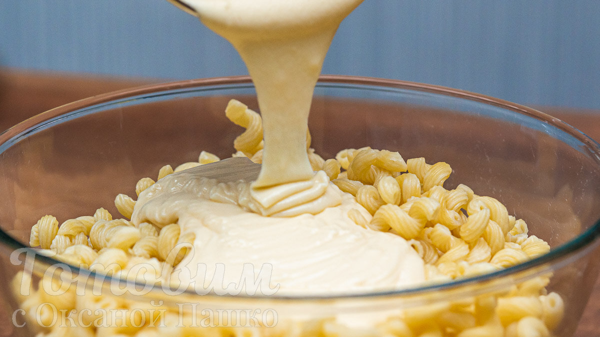 4. Переложите макароны в миску, полейте их сырным соусом и аккуратно перемешайте.