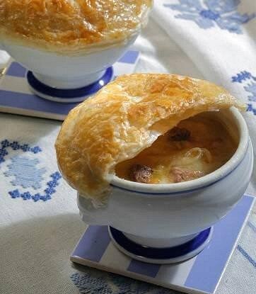 Раскатайте слоеное тесто и вырежьте четыре круга, которые должны быть чуть больше горлышек ваших горшочков. После этого аккуратно разлейте приготовленный суп по горшочкам, заполняя их на две трети.