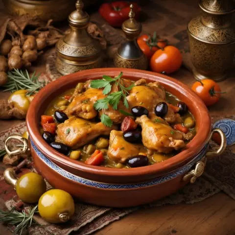 - Приготовление: Обжарьте лук в масле до мягкости, добавьте курицу и обжаривайте до золотистой корочки. Приправьте специями, добавьте мед и оливки, готовьте под крышкой на медленном огне.