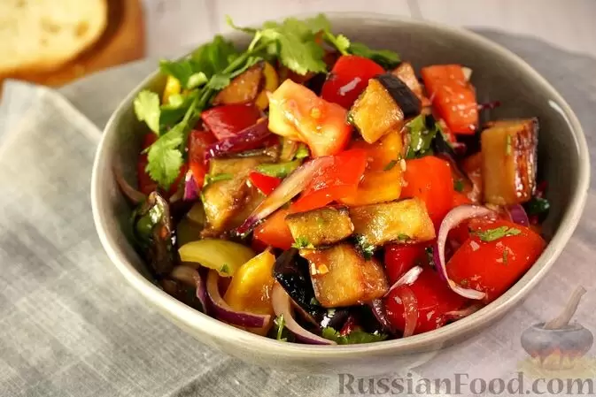 - Салат из обжаренных баклажанов с болгарским перцем: Вдохновленная турецкой кухней, эта вариация порадует любителей пикантных блюд! А добавление чеснока и чили сделает его особенно запоминающимся.