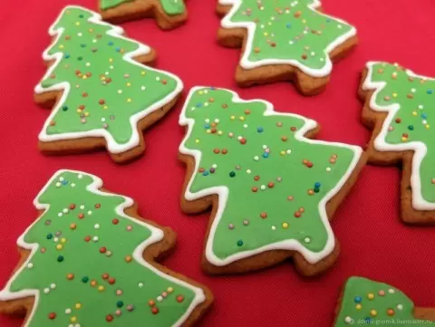 Остуженные пряники глазируются растопленным белым шоколадом, окрашенным зеленым красителем, и посыпаются кондитерской посыпкой. Эти сладости непременно добавят настроение и создадут волшебную атмосферу праздников.