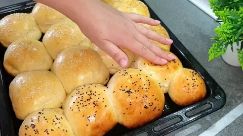 Положите сформированные булочки на противень, накройте пленкой и полотенцем, и оставьте на 20 минут. Затем смешайте желток с молоком и смажьте верхушку ваших булочек. Посыпьте кунжутом и поставьте в разогретую до 180°C духовку на 25-30 минут. Проверяйте готовность с помощью деревянной палочки — она должна выйти сухой.